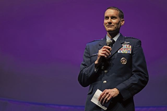 U.S. Air Force Brig. Gen. Stephen P. Snelson, U.S. Air Forces in Europe – Air Forces Africa deputy commander, gives opening remarks at the Kaiserslautern Military Community Christmas concert at the Fruchthalle in Kaiserslautern, Germany, Dec. 12, 2025. The concerts provide an opportunity for building bridges between different communities and fostering mutual understanding through the universal language of music. (U.S. Air Force photo by Senior Airman Edgar Grimaldo)