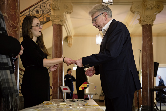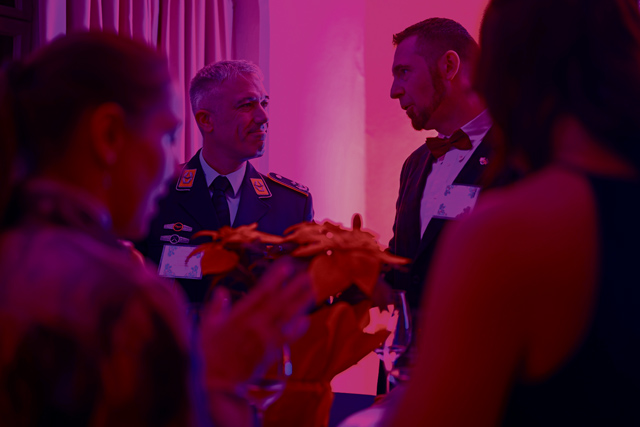 U.S. Air Force Lt. Col. Thomas Mullen, left, HQ Air Command/German Support Unit commander, speaks with Lt. Col. Michael Weis, 86th Maintenance Group honorary commander, at the reception during the Kaiserslautern Military Community Christmas concert at the Fruchthalle in Kaiserslautern, Germany, Dec. 12, 2025. These concerts offer a platform for cultural exchange and sharing of musical traditions between the U.S. Air Force musicians and European audiences. (U.S. Air Force photo by Senior Airman Edgar Grimaldo)