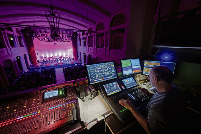 A sound engineer helps the U.S. Air Forces in Europe – Air Forces Africa band by managing the audio levels during the Kaiserslautern Military Community Christmas concert at the Fruchthalle in Kaiserslautern, Germany, Dec. 12, 2025. The concerts provide an opportunity for building bridges between different communities and fostering mutual understanding through the universal language of music. (U.S. Air Force photo by Senior Airman Edgar Grimaldo)