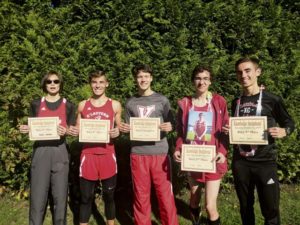 As expected, Griffen Parsells, who has the top time in Europe this fall, won the boys race to remain undefeated and truly untested. He was followed by teammates (left to right below) Brandon Seyler (fifth place) Robert DeWitt (fourth), Ethan Cooper (second) and Reece Harding (third).