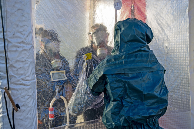 Airmen assigned to the 86th Civil Engineer Squadron are decontaminated in a chamber during an ammonia leak exercise at Ramstein Air Base, Germany, Nov. 22, 2025. This is the first time both U.S. and German forces have participated together in an ammonium leak exercise, increasing the effective emergency response capabilities of both for the Kaiserslautern military community. (U.S. Air Force photo by Senior Airman Vaughn Weber)