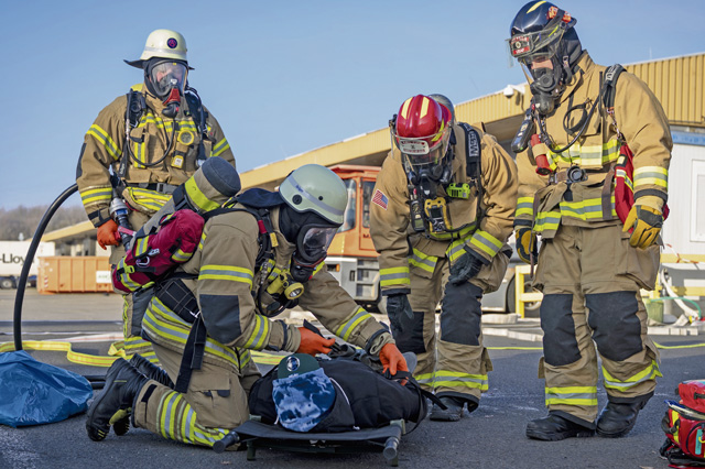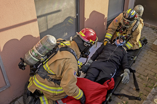 An Airman assigned to the 86th Civil Engineer Squadron and a German firefighter lift a simulated patient during an ammonia leak exercise at Ramstein Air Base, Germany, Nov. 22, 2025. The exercise simulated an ammonia leak in which a worker inhaled chemicals and lost consciousness, requiring coordinated rescue efforts from German and American forces. (U.S. Air Force photo by Senior Airman Vaughn Weber)