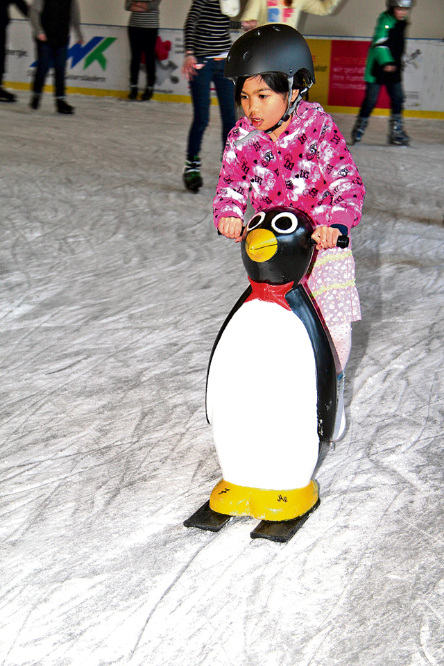 Every Friday afternoon, inexperienced skaters under the age of 14 can take their first steps on the ice with a licensed instructor. The ice skating rink also offers penguins as training aids for beginners for €2 per hour.