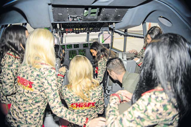 Airmen from the 86th Airlift Wing showcase one of their C-130J Super Hercules to the Kansas City Chiefs cheerleaders during a tour Nov. 2 on Ramstein.
