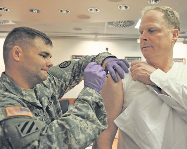 Maj. Gen. Duane A. Gamble, commanding general of the 21st Theater Sustainment Command (left photo), and Brig. Gen. Jon T. Thomas, 86th Airlift Wing commander, receive their annual flu vaccinations. According to the U.S. Army Public Health Command, the flu virus strikes 5 to 20 percent of the U.S. population and claims 36,000 lives yearly. Vaccination opportunities are being offered by various medical agencies throughout the KMC. Personnel should check with their medical personnel or primary care provider for times and locations.