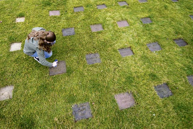 A Kaiserslautern Military Community member cleans a gravestone at the American Kindergraves March 10 in Kaiserslautern. From 1952 to 1971, 451 American infants lost their lives at birth or shortly after birth at local hospitals. Families buried the remains of those children in a cemetery near the U.S. Army Daenner Kaserne and named the memorial Kindergraves.