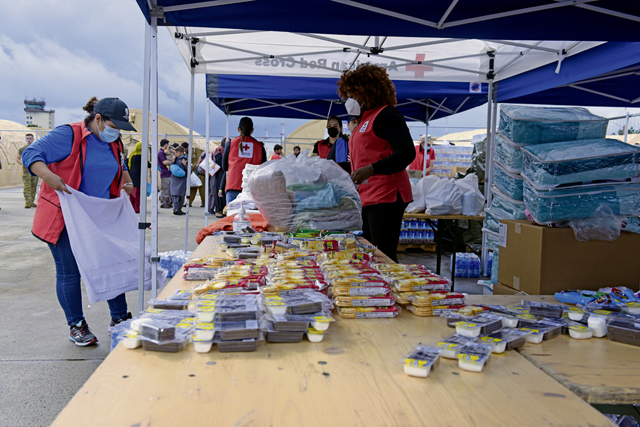 Red Cross volunteers fold towels at Ramstein Air Base, Aug. 22. The volunteers passed out towels, food and other donated items in support of Operation Allies Refuge. Team Ramstein along with U.S. Army brethren, families and volunteers are aiding evacuees from Afghanistan. (U.S. Air Force photo by Airman 1st Class Madelyn Keech)