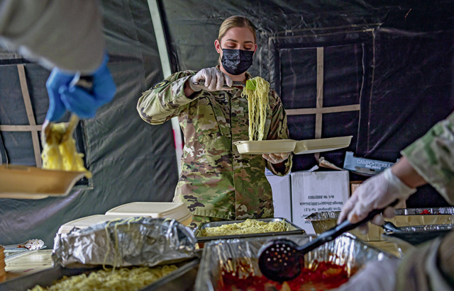 U.S. Air Force Staff Sgt. Samantha Perez, United States Air Forces in Europe and Air Forces Africa Headquarters commander’s enlisted aid, prepares dinner meals for evacuees at Ramstein Air Base, Aug. 26. Perez volunteered to support Operation Allies Refuge through preparing meals for evacuees and also donated shoes, baby formula, diapers and wipes to evacuee children. (U.S. Air Force photo by Airman Jared Lovett)
