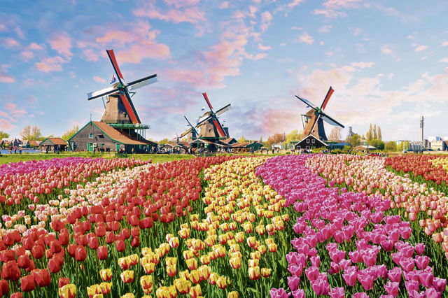 Landscape,With,Tulips,,Traditional,Dutch,Windmills,And,Houses,Near,The