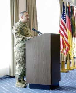 Maj. Gen. Steven A. Shapiro, 21st Theater Sustainment Command commanding general, opens the third annual Law Day Lunch May 10 at the Ramstein Air Base Officers Club with remarks about what it means to have the opportunity for German lawyers and U.S. military lawyers to collaborate. The Law Day Lunch is an annual event held to build partnerships between German lawyers and U.S. military lawyers and to discuss how one another can better assist in the event a situation requires legal aid.