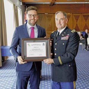 Col. John S. Frost (right), Staff Judge Advocate 21st Theater Sustainment Command, presents Philipp Fernis, German Undersecretary of the Ministry of Justice, Mainz, with a certificate for his honorary induction into the 21st Theater Sustainment Command Bar Association during an annual Law Day Lunch May 10 at Ramstein Air Base Officers Club. Fernis is the third honorary member to be inducted into the 21st TSC Bar Association and has been the guest speaker every year since the start of the Law Day Lunch.