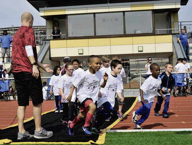 Participants sprint toward the field as the football camp, organized by the USO, begins at Kaiserslautern High School April 1 on Vogelweh. The sold out football camp taught children the fundamentals of football during the two-day offensive and defensive skills camp.