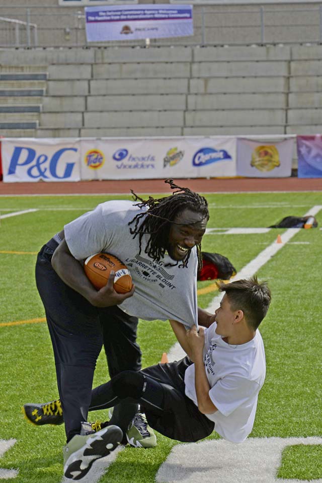 New England Patriots running back LeGarrette Blount tumbles past a defender as he returns a fumble at a football camp at Kaiserslautern High School April 1 on Vogelweh. Blount challenged some participants to a one-on-one rushing drill during his football camp.