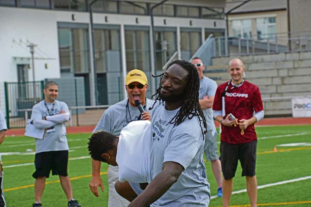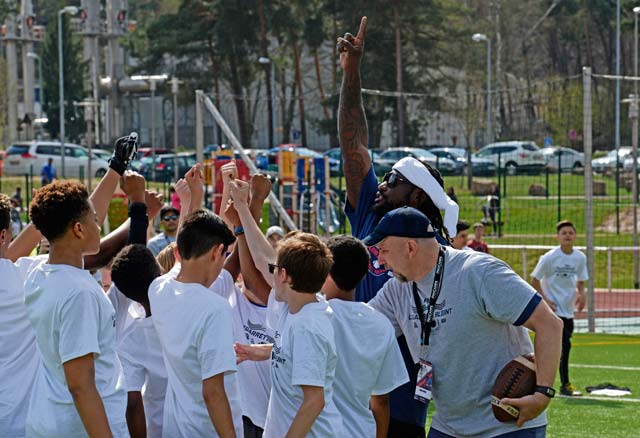 New England Patriots running back LeGarrette Blount disperses a huddle with a chant at a football camp at Kaiserslautern High School April 1 on Vogelweh. Blount shuffled between teams performing and instructing a series of offensive and defensive skills drills.