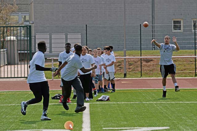 Coaches; 569th United States Forces Police Squadron security forces journeyman, Airman DeMarco Matthews; and 1st Combat Communications Squadron radio frequency transmissions technician, Airman 1st Class Zachery Johnson, lead participants through a wide receiver drill during football camp at Kaiserslautern High School April 1 on Vogelwegh. The sold out football camp taught children the fundamentals of football during the two-day offensive and defensive skills camp.