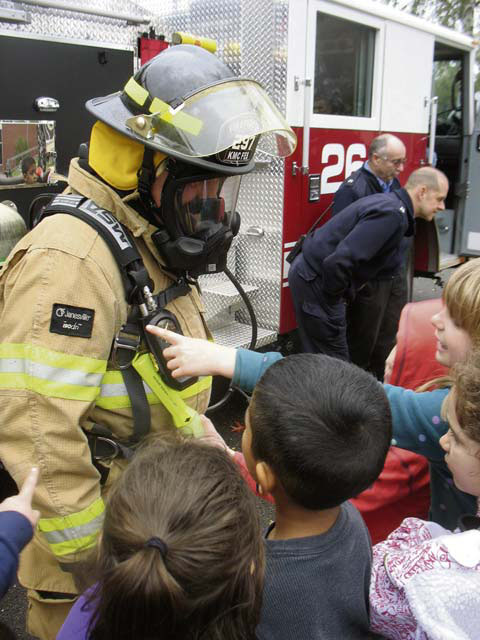 Firefighters Carsten Beberich, Patrick Stephan, Marcel Kolb and Sascha Dillinger visited Landstuhl Elementary and Middle School recently to talk about fire safety. Students in Julie Wittenberg’s class were excited and captivated by Sparky the Fire Dog.
