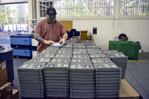 “The plates come through the logistics readiness squadron, and from there we bring them to the production line the contractors have set up,” said Senior Master Sgt. Ryan Love, 86th LRS materiel management flight chief. “They unbox each asset and screen about 10,000 a week.”