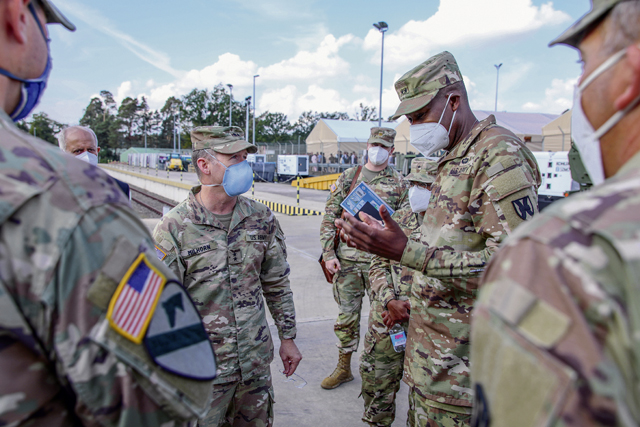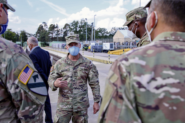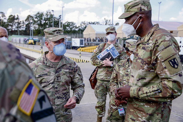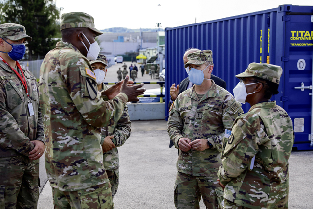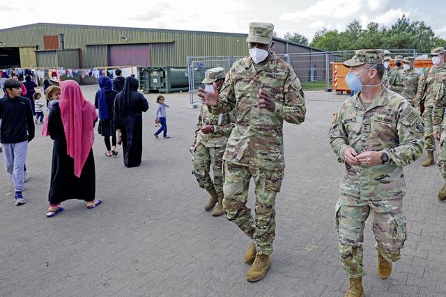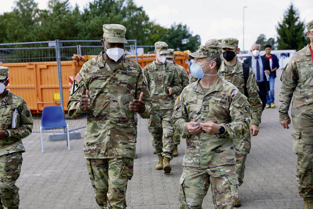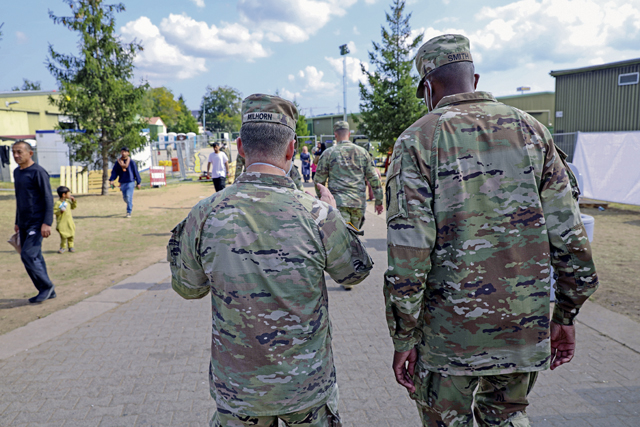 Maj. Gen. James M. Smith, the 21st Theater Sustainment commander, gives Maj. Gen. Jeffrey L. Milhorn, the U.S. Army Corps of Engineers deputy commanding general for military and international operations, a tour of the Operation Allies Welcome on Rhine Ordnance Barracks, Germany, September 18, 2021. During the tour, Milhorn got to see how 21st TSC organized the travelers and received feedback from Smith on the ongoing operations.