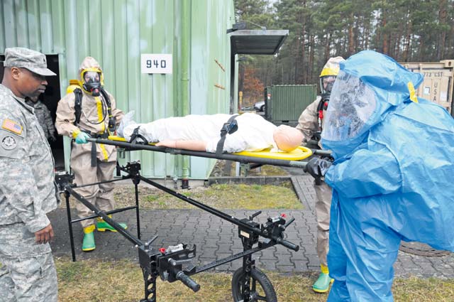 Staff Sgt. Windell Reeder (left), a member of the 773rd Civil Support Team, directs Soldiers in protective suits from the 212th Combat Support Hospital on how to transport a casualty April 11 at Rhine Ordnance Barracks. The 773rd CST trained the 212th CSH Soldiers on how to evaluate and transport a casualty in a chemical and biological environment. The 212th CSH plans to integrate what they learned into their next training exercise in Miesau, Germany.