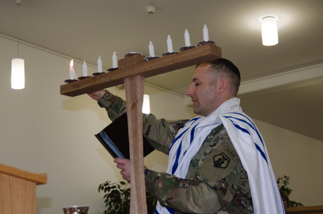 Chaplain (Maj.) Jonathan Zagdanski, 7th Mission Support Command, lights a Menorah to officially begin the celebration of Hanukkah Dec. 6 on Ramstein. The Festival of Lights historically goes back to 168 B.C. to the time of Judas Maccabeaus, who ordered an 80-day celebration following the rededication to the Temple in Jerusalem. Hanukkah runs through Sunday.