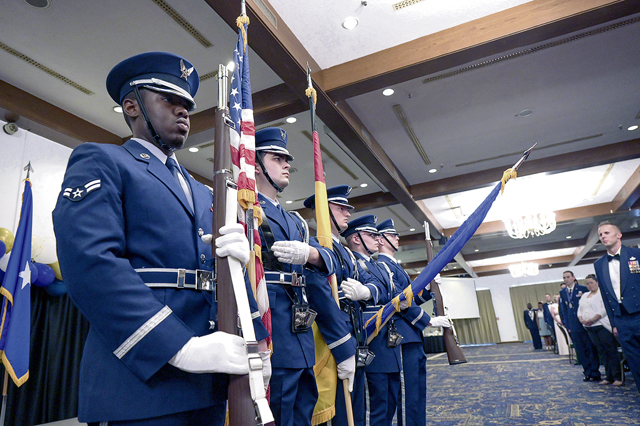 The Ramstein Air Base Honor Guard presents the colors at a senior noncommissioned officer induction ceremony at Ramstein Air Base, Germany, July 21, 2023. The ceremony is a significant milestone in the career of the enlisted personnel, marking their transition into senior leadership roles. (U.S. Air Force photo by Airman 1st Class Kaitlyn Oiler)