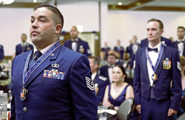 Senior noncommissioned officer inductees stand in recognition of their achievements at a ceremony at Ramstein Air Base, Germany, July 21, 2023. The ceremony served as a moment of pride and celebration for the inductees and their families, as well as recognition of their increase in responsibilities as leaders. (U.S. Air Force photo by Airman 1st Class Kaitlyn Oiler)