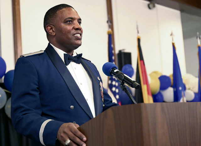 U.S. Air Force Brig. Gen. Otis C. Jones, 86th Airlift Wing commander, addresses the senior noncommissioned officer inductees at a ceremony at Ramstein Air Base, Germany, July 21, 2023. A SNCO induction ceremony is a significant milestone in the career of enlisted personnel, marking their transition into senior leadership roles within the U.S. Air Force. (U.S. Air Force photo by Airman 1st Class Kaitlyn Oiler)