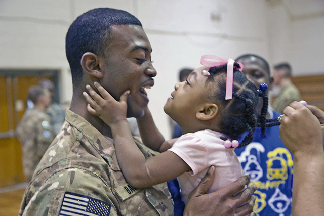 Sgt. Tre Baity, Company E, 3rd Combat Aviation Brigade, gets a warm welcome from his daughter during the Welcome Home ceremony at Fort Stewart March 13. The Soldiers returned from a nine-month deployment to Afghanistan. (Photo by Sgt. William Begley, 3rd CAB Public Affairs)