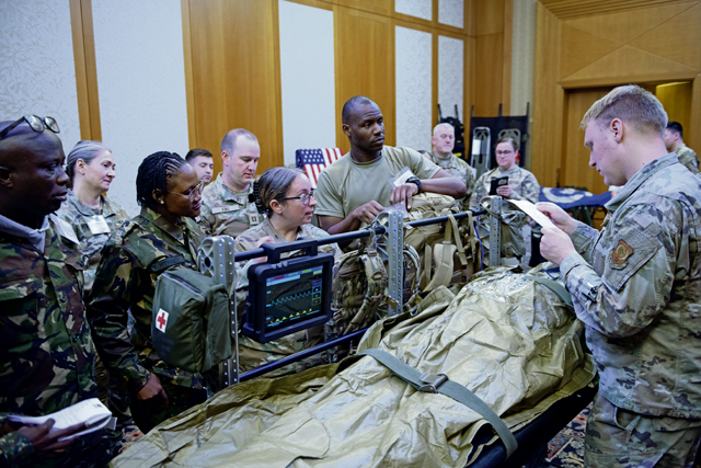 “We have several hours over the course of days where we are all practicing our field care exercises,” said U.S. Air Force Maj. Keshia Brown, Landstuhl Regional Medical Center primary care flight commander. “We want to ask how other countries do procedures so we can all collaborate and do it the best way.”
