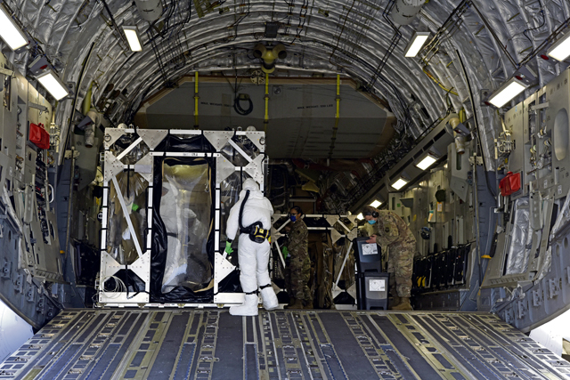 U.S. Air Force Airmen assigned to the 521st Air Mobility Operations Wing decontaminate a Transport Isolation System on a U.S. Air Force C-17 Globemaster III aircraft, after the transport of a potentially infectious patient to Ramstein Air Base, May 8. The mission marked the fourth mission and the 14th patient moved using the TIS since its first operational use on April 10. The TIS is an infectious disease containment unit designed to minimize contamination risk to aircrew and medical attendants while allowing in-flight medical care for patients afflicted by a disease like coronavirus disease 2019. Presently, Air Mobility Command has multiple TIS Force Packages on alert at Ramstein, Travis AFB, and Joint Base Charleston, to support global requirements that may arise.