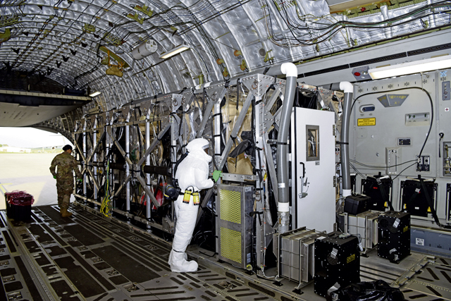 U.S. Air Force Senior Airman Jason McGhee, 313th Expeditionary Operations Support Squadron biomedical equipment technician, left, and Senior Airman Antonio Candler, 313th EOSS medical logistics, decontaminate a Transport Isolation System on a U.S. Air Force C-17 Globemaster III aircraft, after the transport of a potentially infectious patient to Ramstein Air Base, May 8.