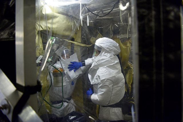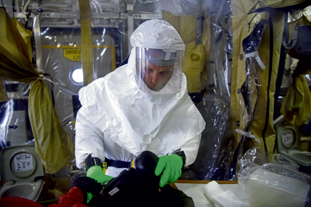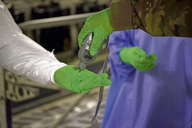 U.S. Air Force Airmen assigned to the 521st Air Mobility Operations Wing sanitize their hands after decontaminating a Transport Isolation System on a U.S. Air Force C-17 Globemaster III aircraft, after the transport of a potentially infectious patient to Ramstein Air Base, May 8.