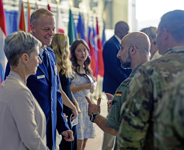 U.S. Air Force Maj. Gen. Derek France, Third Air Force commander, meets with attendees of the assumption of command at Ramstein Air Base, Germany, June 22, 2022. With this assumption of command, France became the 56th commander of 3 AF. He is now charged with leading all the wings in USAFE-AFAFRICA, and the command’s 32,000 Airmen. (U.S. Air Force photo by Airman 1st Class Edgar Grimaldo)