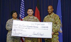 Colonel Donnette Boyd, (left) 86th Airlift Wing wing chaplain, and Senior Master Sgt. Braderick Adams, (right) 86th AW religious affairs superintendent, present Senior Master Sgt. Jason David, 86th AW Public Affairs senior enlisted advisor, with a donation check to the Air Force Wounded Warrior Foundation during the National Prayer Breakfast held at the Ramstein Officers’ Club on Ramstein Air Base, April 4, 2019. David is a Purple Heart recipient for actions taken during combat and he shared his story with attendees.
