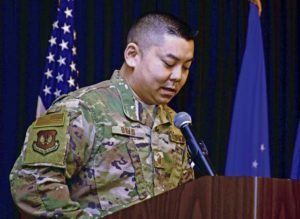 Senior Master Sgt. Jason David, 86th Airlift Wing Public Affairs senior enlisted advisor, tells his warrior story as the guest speaker during the National Prayer Breakfast held at the Ramstein Officers’ Club on Ramstein Air Base, April 4. The theme for this year’s breakfast was “A Warrior’s Story.”