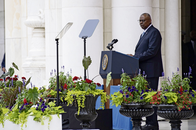 Secretary of Defense Lloyd Austin III speaks during the National Memorial Day Observance in the Memorial Amphitheater at Arlington National Cemetery, Arlington, Va., May 27, 2024. (U.S. Army photo by Elizabeth Fraser / Arlington National Cemetery)