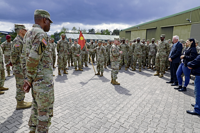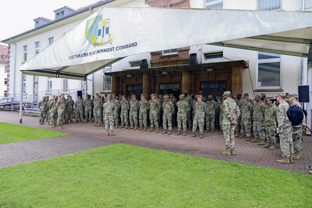 Gen. Christopher Cavoli, United States Army Europe and Africa commanding general, visits troops from the 21st Theater Sustainment Command and presents coins at Panzer Kaserne in Kaiserslautern, Germany on April 26, 2022. Gen. Cavoli thanked them for all the hard work the Soldiers have done and sacrifices them and their families have made during the past few months.
