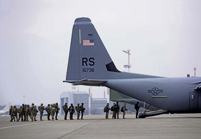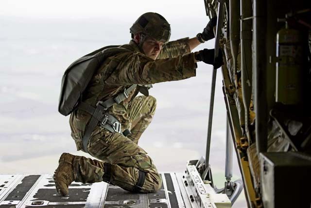 A U.S. Army jumpmaster looks out of a U.S. Air Force C-130J Super Hercules over Alzey Drop Zone, Dec. 6. The jumpmaster verified the sky conditions before giving the all clear signal to the paratroopers inside the C-130J. — Photo by Senior Airman Devin M. Rumbaugh