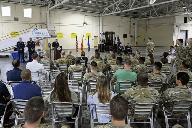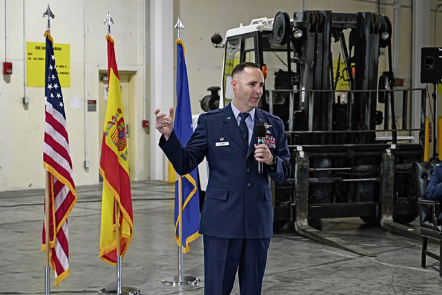 NAVAL STATION ROTA, Spain (July 10, 2025) Col. Ryan Herman, incoming commander of 521st Air Mobility Operations Group, provides remarks during a change of command ceremony onboard Naval Station (NAVSTA) Rota, Spain, July 10, 2025. The 521 AMOG conducts en route operational support and aircraft maintenance, air mobility command and control, and aerial port operations, integrated with the Joint deployment and distribution enterprise and in concert with our allies and partners, to deploy and sustain the joint force in Africa, Asia, and Europe in support of national objectives. (U.S. Navy photo by Mass Communication Specialist 2nd Class Jett Morgan)