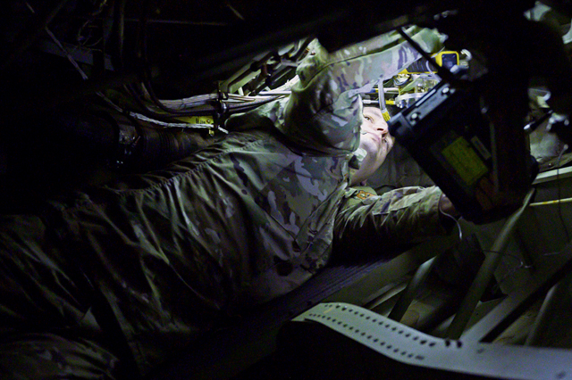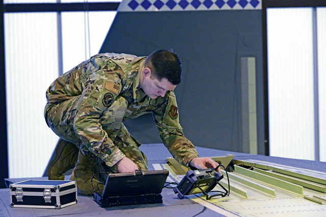 U.S. Air Force Tech. Sgt. Zachary Pierce, 86th Maintenance Squadron non-commissioned officer in charge of nondestructive inspections, scans the interior of a C-130J Super Hercules aircraft at Ramstein Air Base, Feb. 5. NDI Airmen are part of the fabrication flight in the 86th MXS along with the aircraft metals technology and aircraft structural maintenance sections.