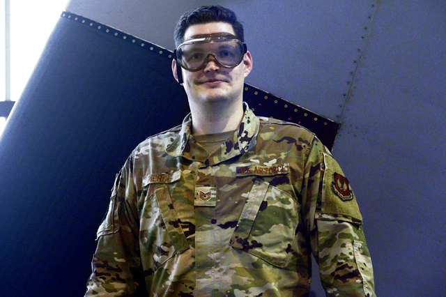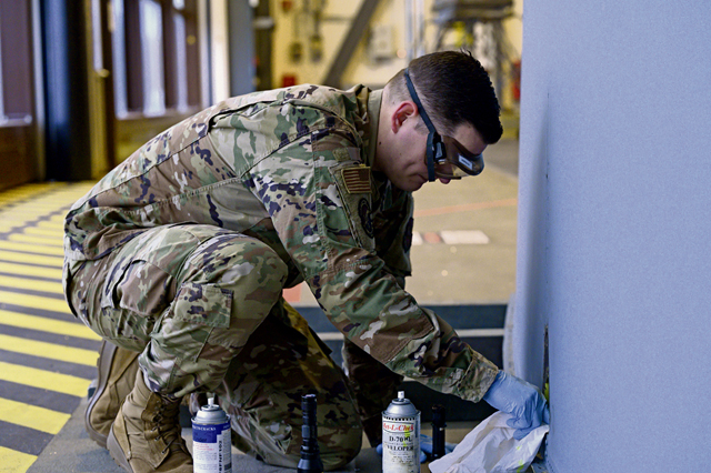 U.S. Air Force Tech. Sgt. Zachary Pierce, 86th Maintenance Squadron non-commissioned officer in charge of nondestructive inspections, poses for a photo at Ramstein Air Base, Feb. 5. NDI Airmen use various inspections to detect flaws in aircrafts, including ultrasonic, eddy current, magnetic particle, and fluorescent penetrant inspections.