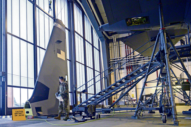 U.S. Air Force Tech. Sgt. Zachary Pierce, 86th Maintenance Squadron non-commissioned officer in charge of nondestructive inspections, examines a C-130J Super Hercules aircraft tail at Ramstein Air Base, Feb. 4. NDI Airmen inspect various sections of aircraft for cracks and deficiencies.