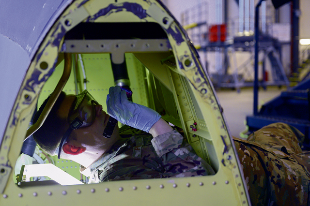 U.S. Air Force Tech. Sgt. Zachary Pierce, 86th Maintenance Squadron non-commissioned officer in charge of nondestructive inspections, inspects the tail of a C-130J Super Hercules aircraft at Ramstein Air Base, Feb. 4. Fluorescent penetrant inspections use fluorescent to detect cracks in the interior of the aircraft that would normally be too dark to see.