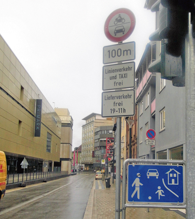 Officials of the Westpfalz Police Headquarters ask motorists to obey the new traffic route near the mall in downtown Kaiserslautern. During a recent four-hour check by German Polizei, 81 motorists were fined €20 each. Coming from Koenigstrasse, the correct route turns left and not straight.