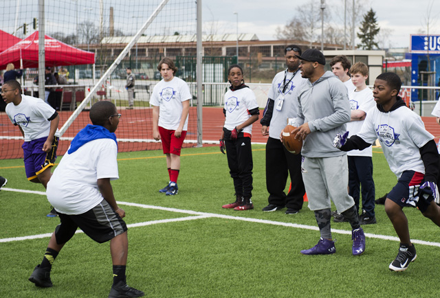 Amare Francois, son of Jennifer Colbert, guards Steve Smith, Baltimore Ravens wide receiver, during the ProCamps event. Francois successfully stopped Smith from catching the ball.