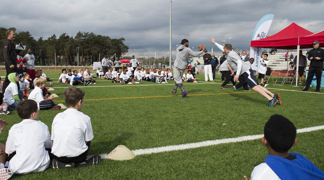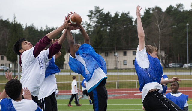 Darrick Henderson Jr., center, son of Zachary Warren, intercepts a pass April 11, 2015, at Vogelweh Military Complex, Germany. During the camp, attendees learned the fundamentals of football through drills, skill development, seven-on-seven games and interactions with local coaches. (U.S. Air Force photo/Senior Airman Damon Kasberg)