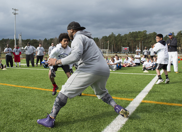 Steve Smith, Baltimore Ravens wide receiver, looks for an open teammate to pass the ball to during a ProCamps event April 11, on Vogelweh. Smith, three-time All-Pro NFL wide receiver, played all-time quarterback during the camp, jumping into different scrimmages to throw touchdown passes to children.
