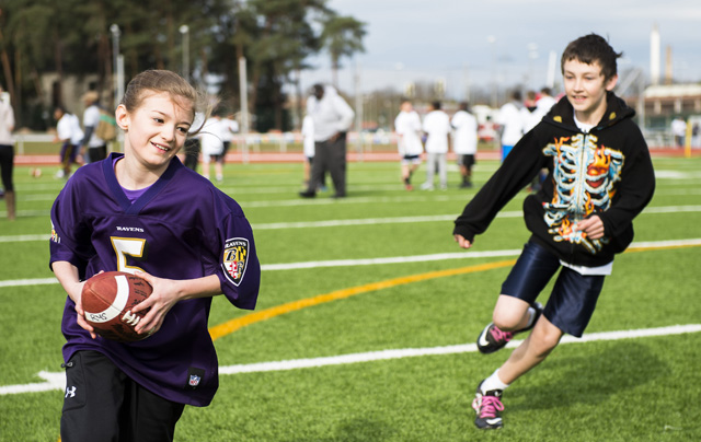 Anya Chervak, daughter of Steven Chervak, runs past a defender during a ProCamps event April 11, 2015, at Vogelweh Military Complex, Germany. Attendees of the camp had the opportunity to meet Steve Smith, Baltimore Ravens wide receiver, who demonstrated football techniques, autographed shirts and participated in scrimmages. (U.S. Air Force photo/Senior Airman Damon Kasberg)