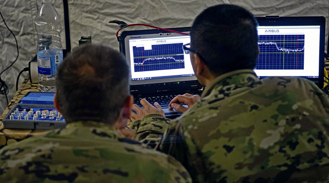 U.S. Air Force Tech. Sgt. Aaron Hickerson, left, 1st Combat Communications Squadron non-commissioned officer in charge of flexible communications package, and Airman 1st Class Yekun Yang, right, 1st CBCS radio frequency transmissions system technician, monitor a spectrum analyzer to determine if their signal is being jammed during exercise HEAVY RAIN 23, at Grostenquin, France, Nov. 16, 2023. HEAVY RAIN is a U.S. Air Forces in Europe-led command and control exercise that integrates communicators, operators and aggressors from joint forces, NATO allies and partners, testing and evaluating their communication and data-sharing capabilities in a rapidly changing operating environment. (U.S. Air Force photo by Senior Airman Jared Lovett)