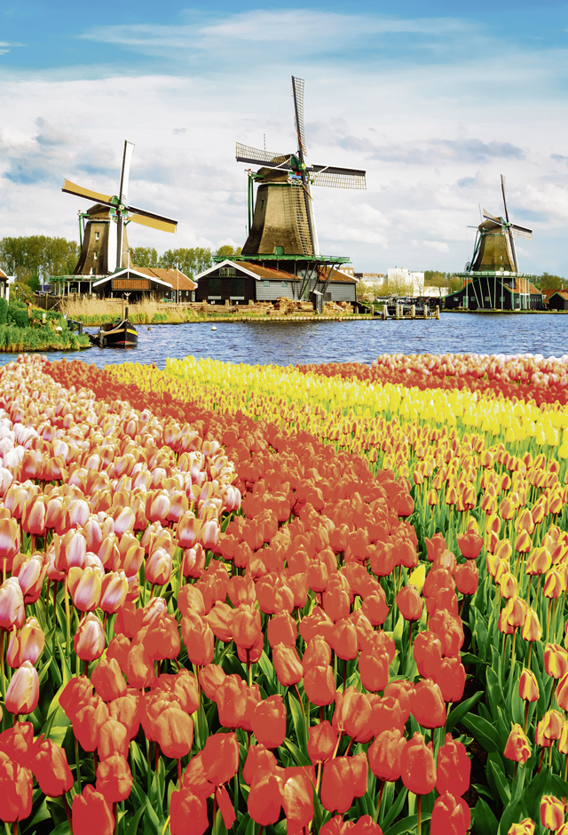 One,Dutch,Windmill,Over,Tulip,Flowers,Field,In,Sunny,Day,